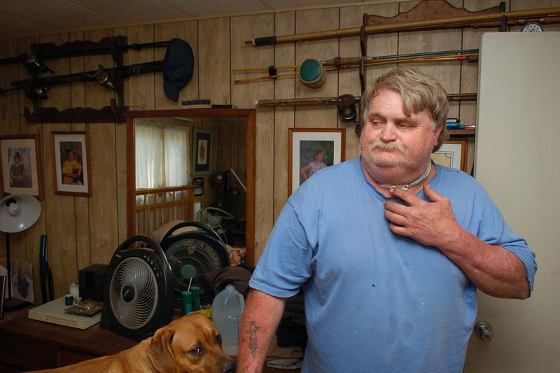 Chuck Rider lights up a cigarette in front of his trailer. He wears a device that allows him to talk. He also pointed out numerous places where he and his daughter Ashley had fallen through the floor many times.